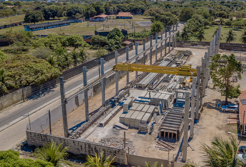 Nosso parque fabril possui capacidade instalada para produção de estrutura de concreto pré-fabricado/mês de 1.000 m³. Contamos atualmente com pórticos rolantes dimensionados para içamento e transporte de peças com até 25 toneladas e pistas de concretagem extremamente versáteis, nos capacitando atender praticamente todos os tipos de estrutura pré-fabricada, tanto em complexidade técnica como em suas dimensões e peso.